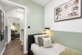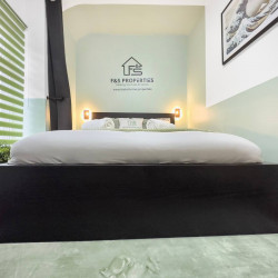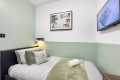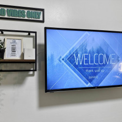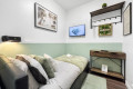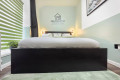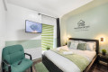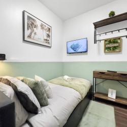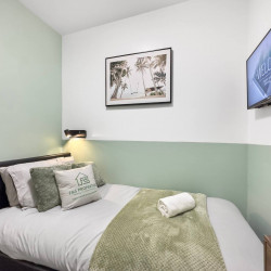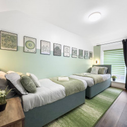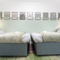 3 Bedrooms. There is a Doube bedroom, Twin bedroom and Single bedroom (sleeps 5 comfortably). All bedrooms have SMART TV’s, mood lighting plush bedding and ample storage for personal belongings. Modern artwork bring contemporary life to the rooms.