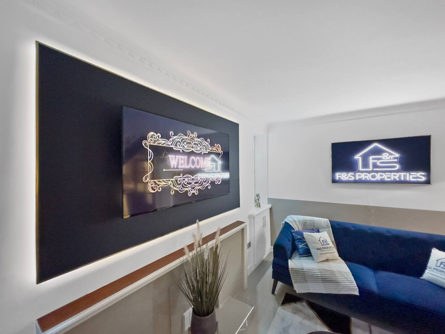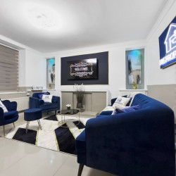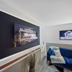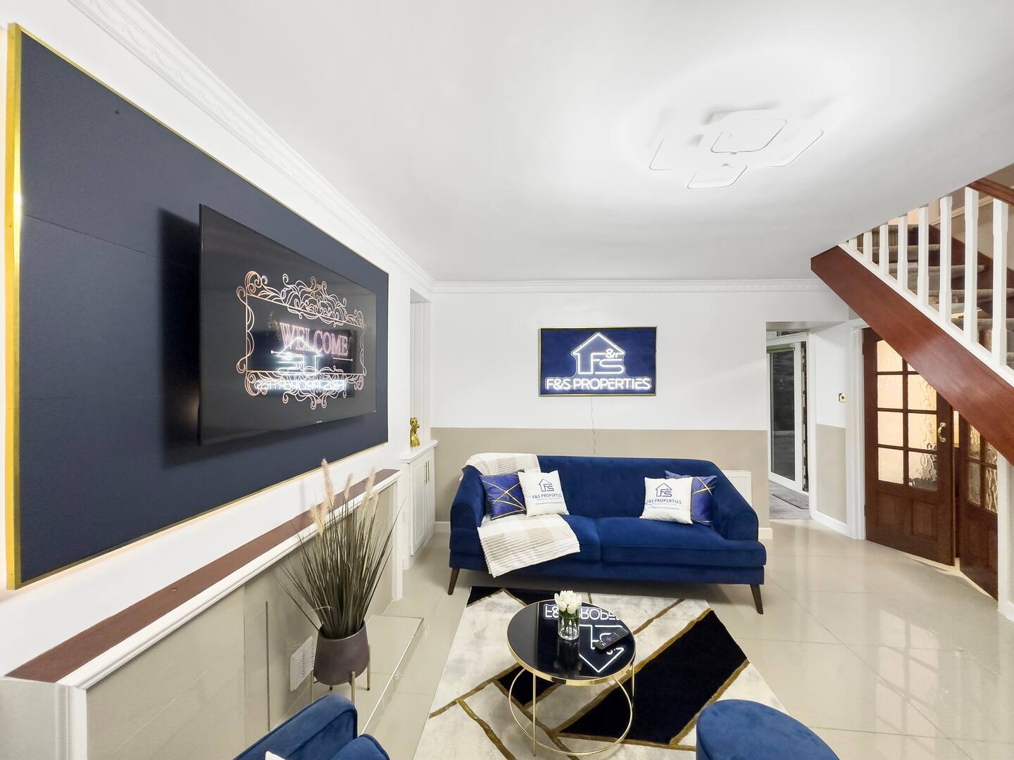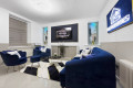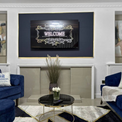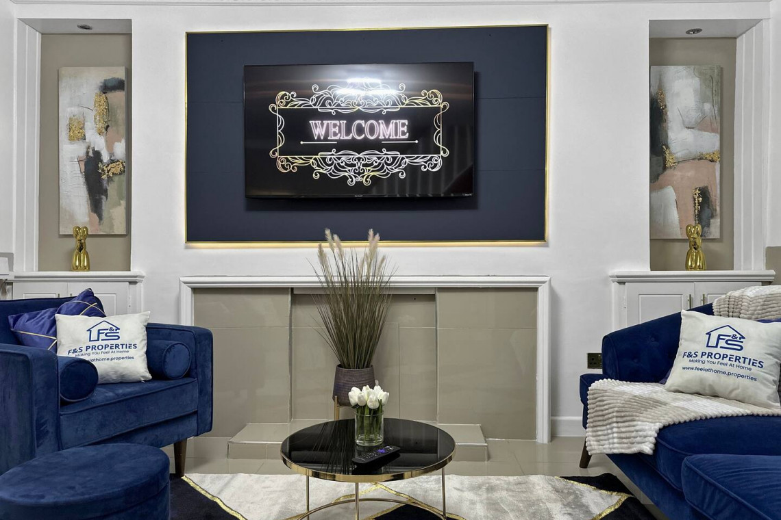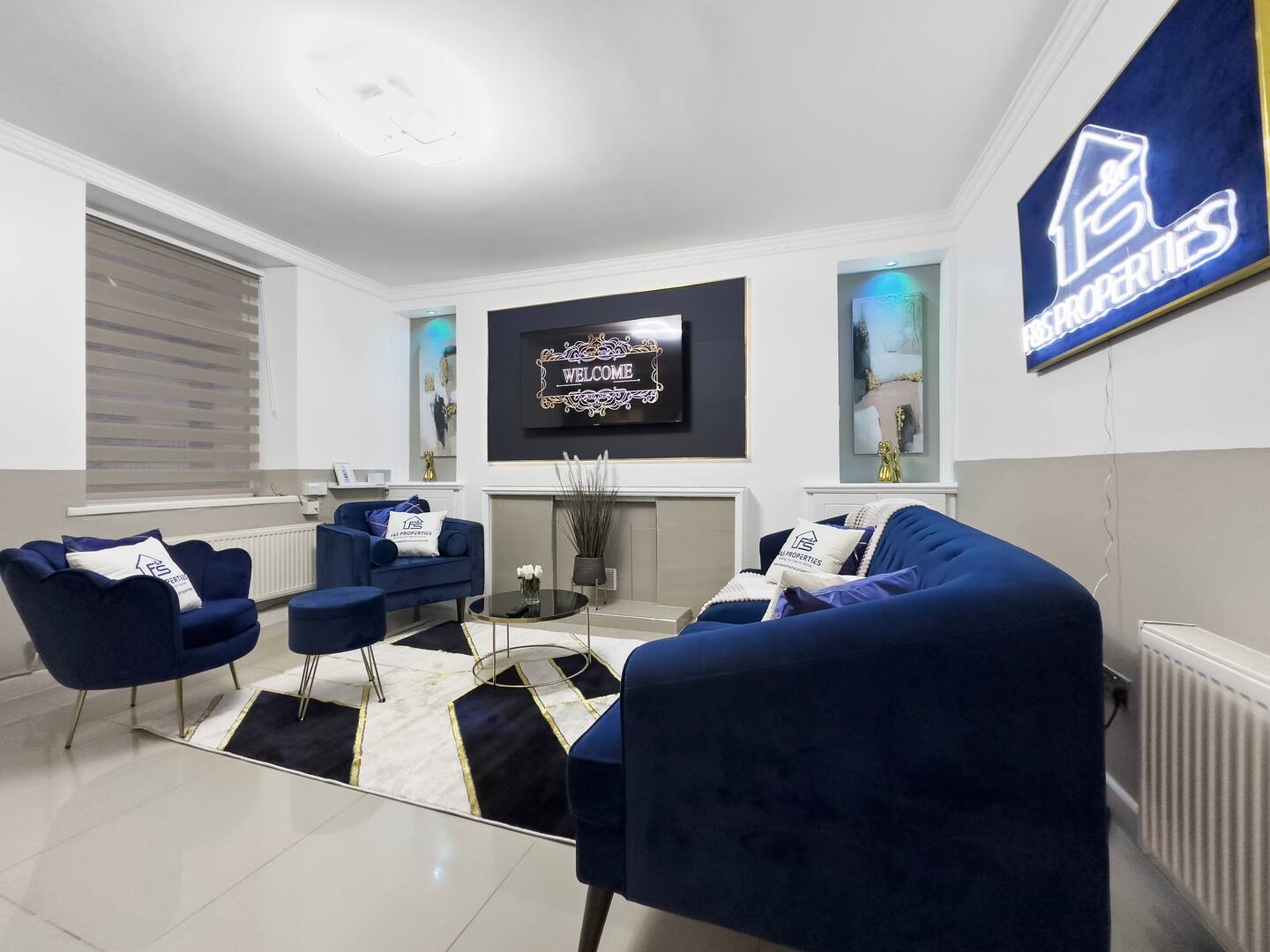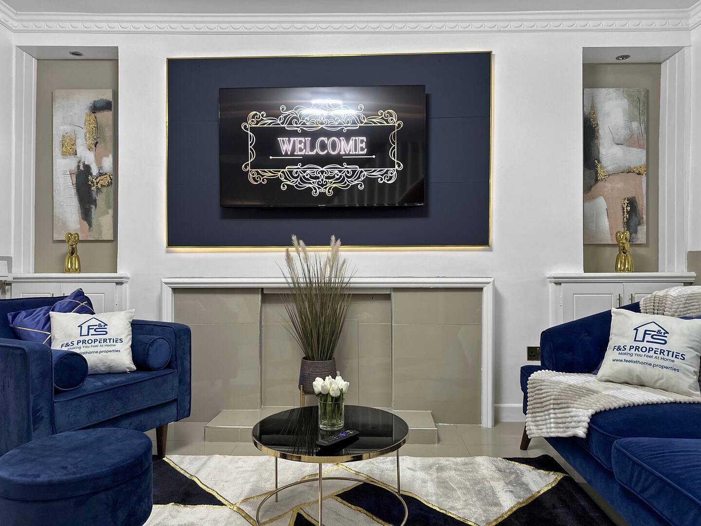 Open plan living room which features a huge 55inch SMART TV (perfect for movie nights or video games), coffee table, and a suite of cosy blue velvet sofas for the ultimate chill-factor.