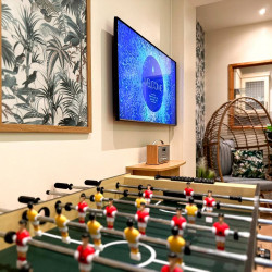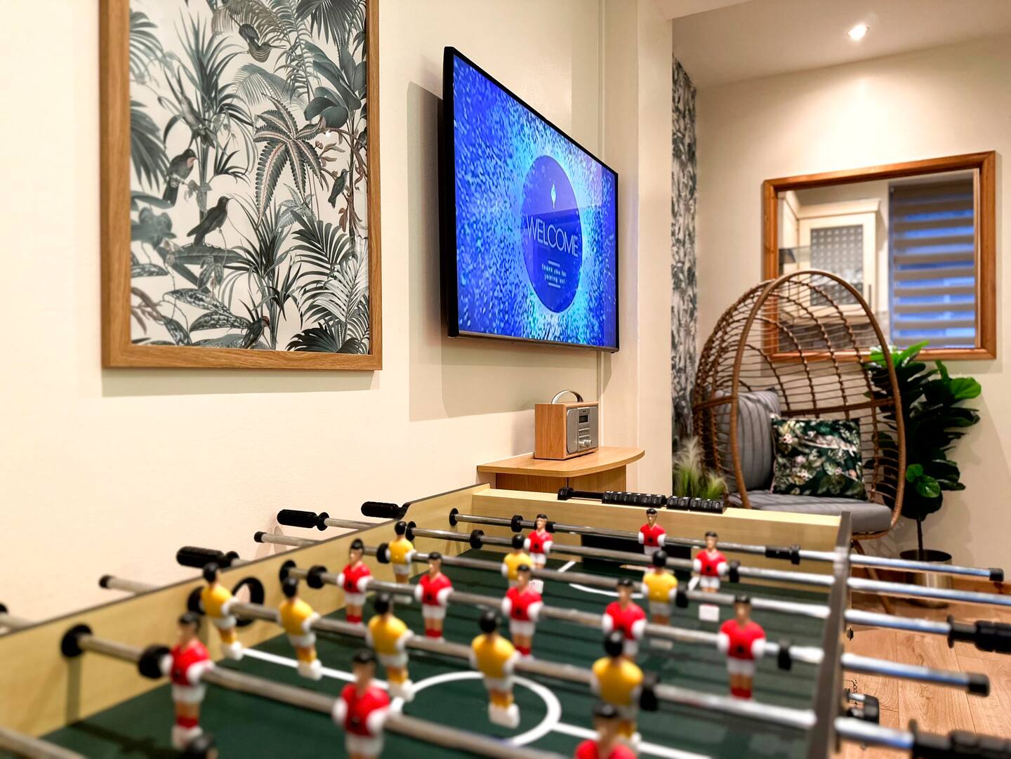 The space has been set up to host and entertain you with all the modern creature comforts as well as a football table.