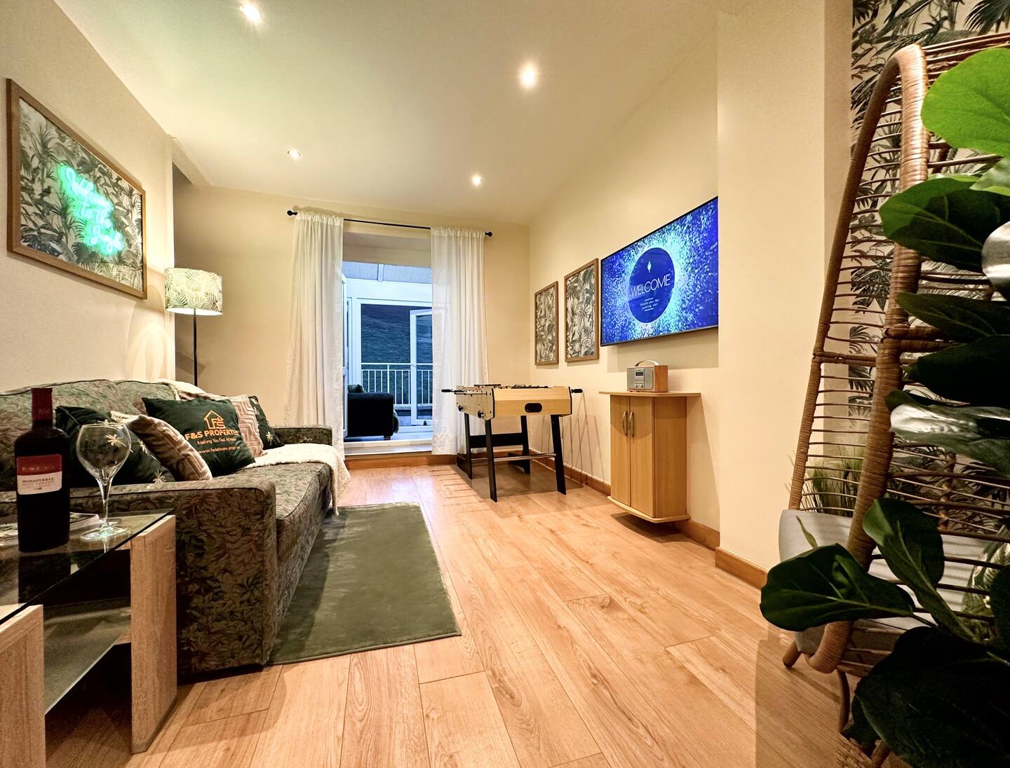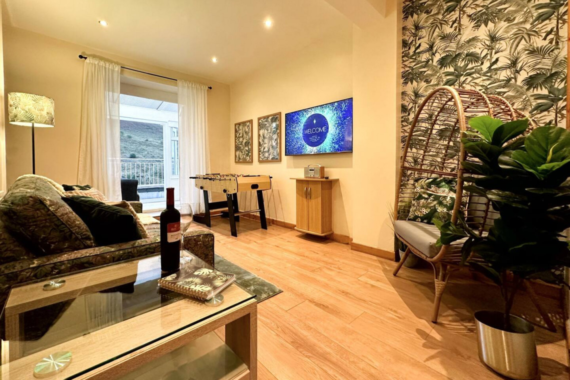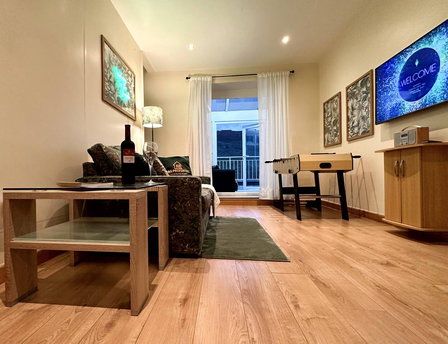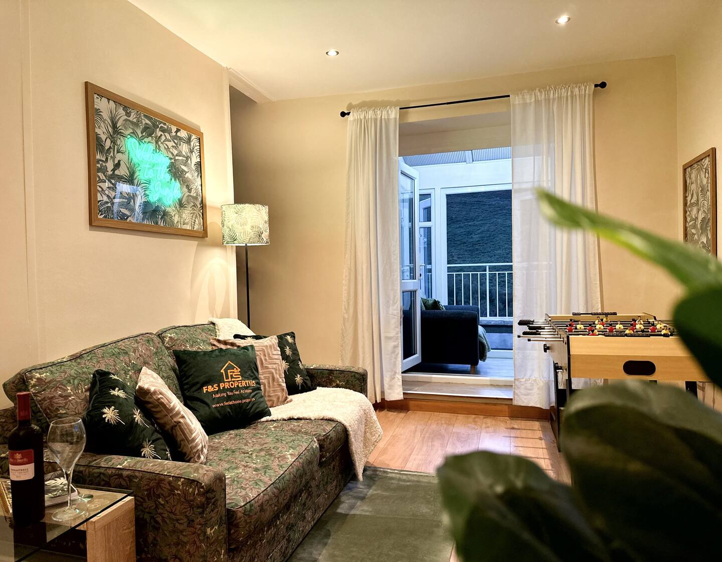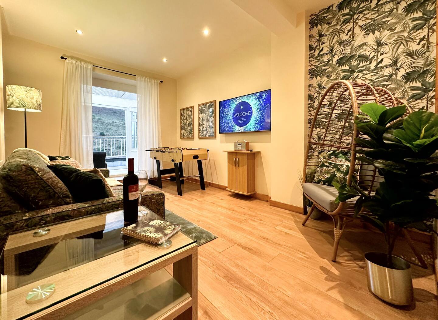 The kitchen flows into an open plan living room which features a large SMART TV, coffee table, a cosy ‘Jungle’ sofa bed and a quirky yet cool egg chair for that ultimate chill-factor. There is a football table for maximum entertainment.