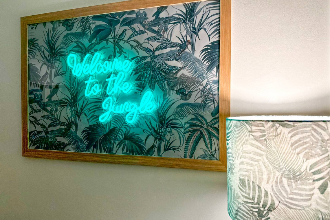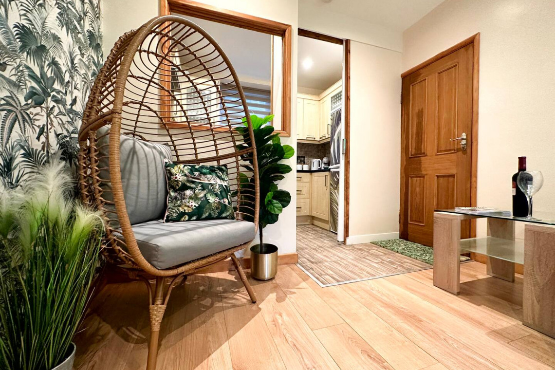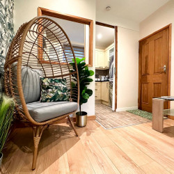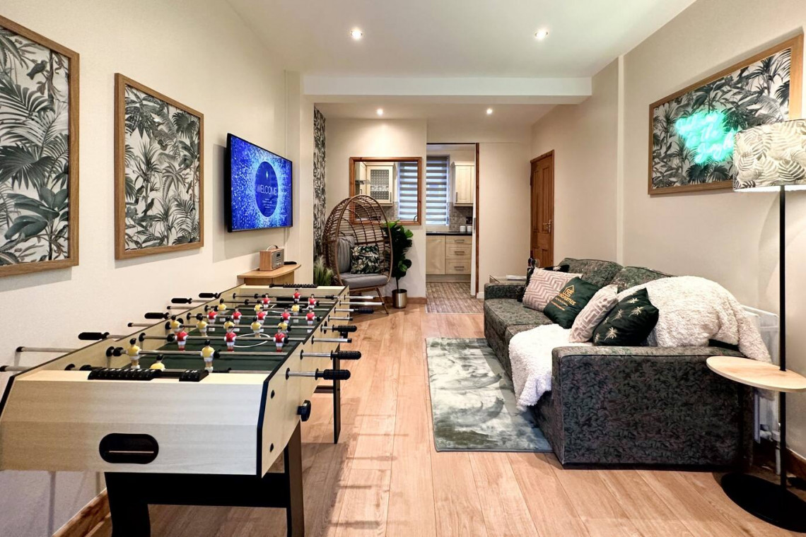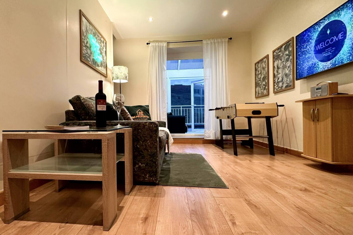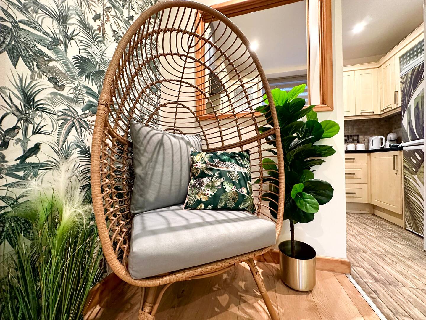 The kitchen flows into an open plan living room which features a large SMART TV, coffee table, a cosy ‘Jungle’ sofa bed and a quirky yet cool egg chair for that ultimate chill-factor. There is a football table for maximum entertainment.