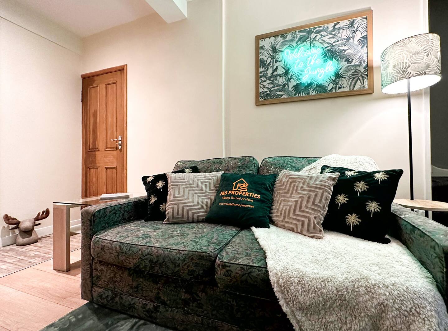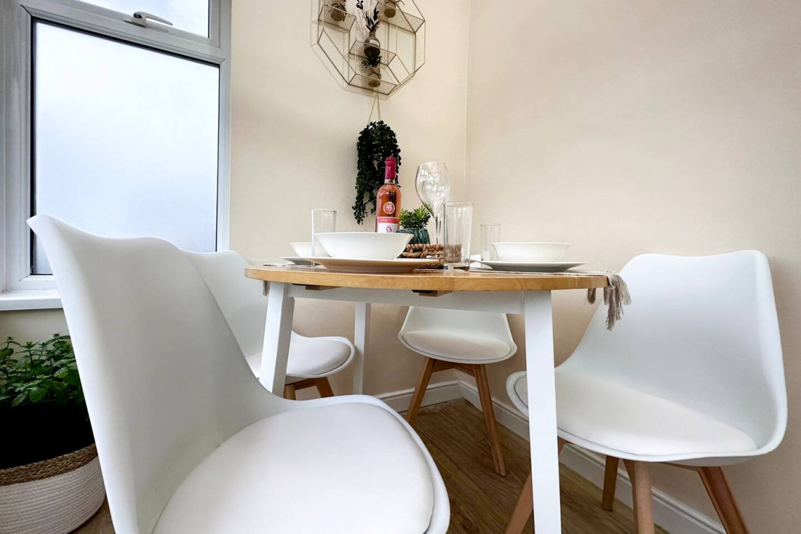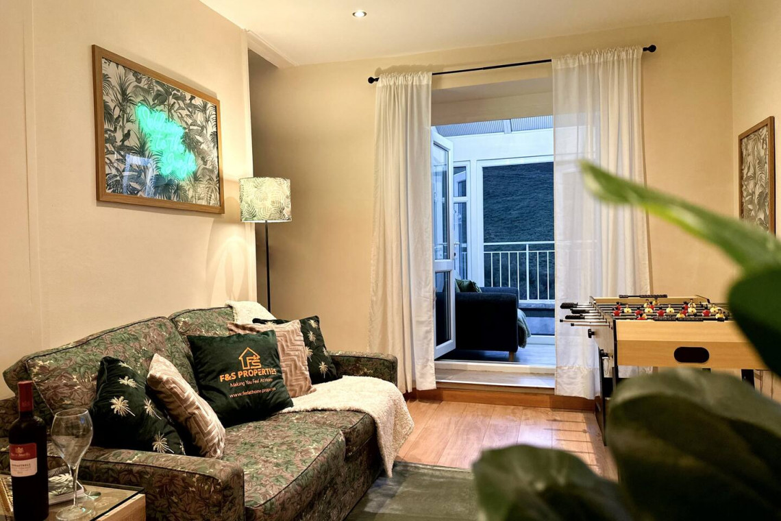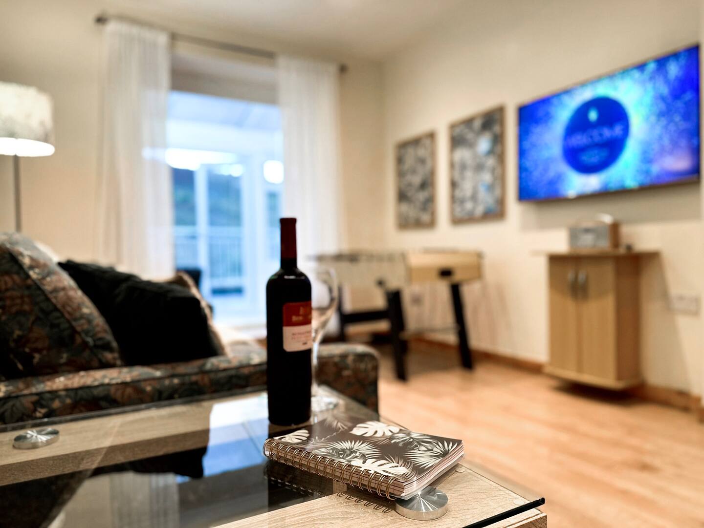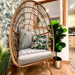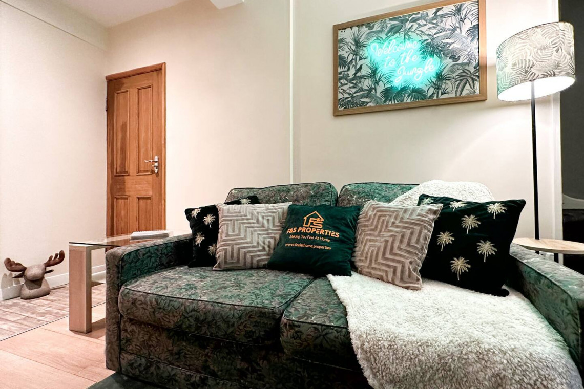 The kitchen flows into an open plan living room which features a large SMART TV, coffee table, a cosy ‘Jungle’ sofa bed and a quirky yet cool egg chair for that ultimate chill-factor. There is a football table for maximum entertainment.