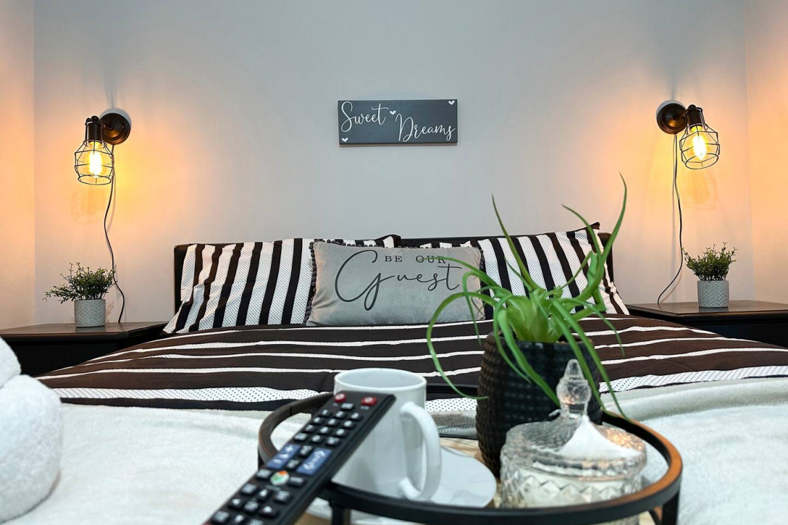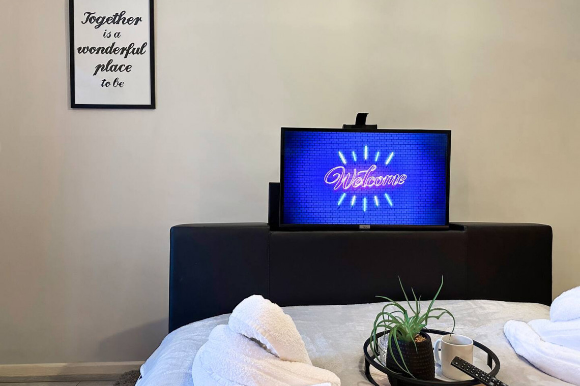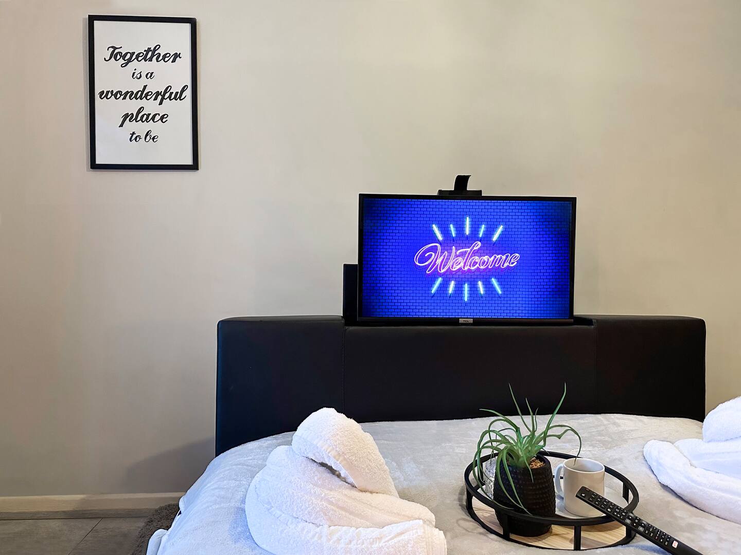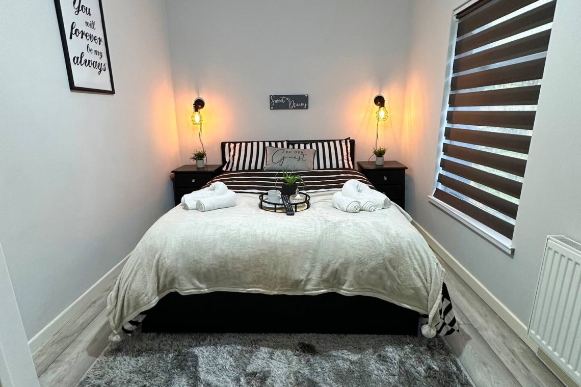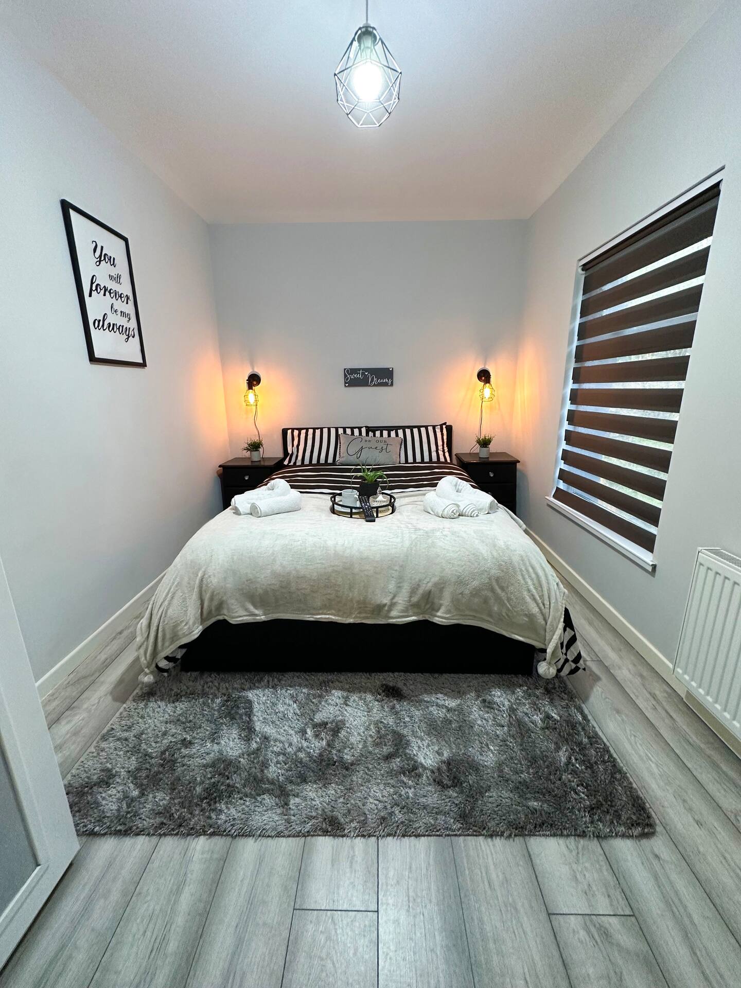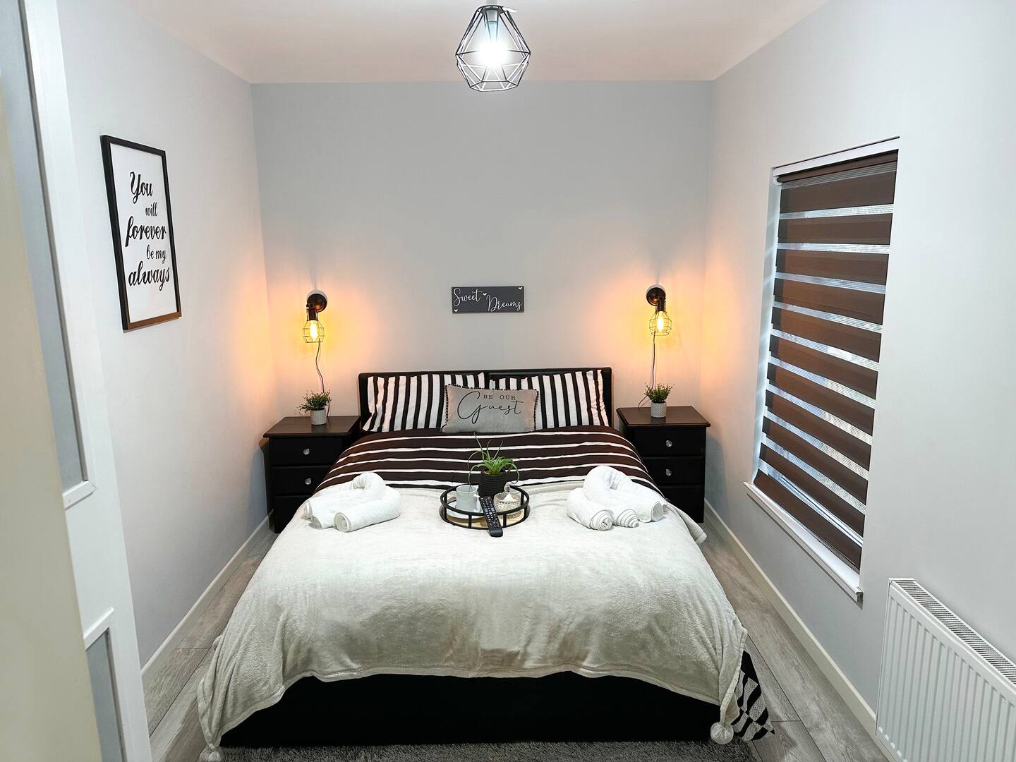 The master bedroom features a king size ‘TV Bed’ with a memory foam topped mattress, perfect for Sunday morning lay-ins.