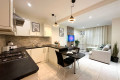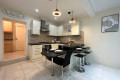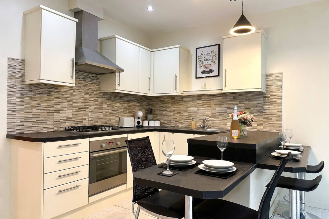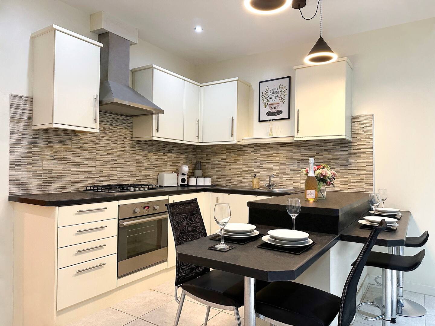The kitchen incorporates a space saving breakfast bar and stools for dining highlighted by fashionable pendant lighting.