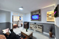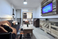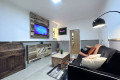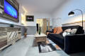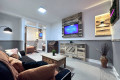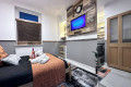 The living room features a comfy click clack sofa bed, a large SMART TV, dedicated workspace and ambiance lighting to set the mood.