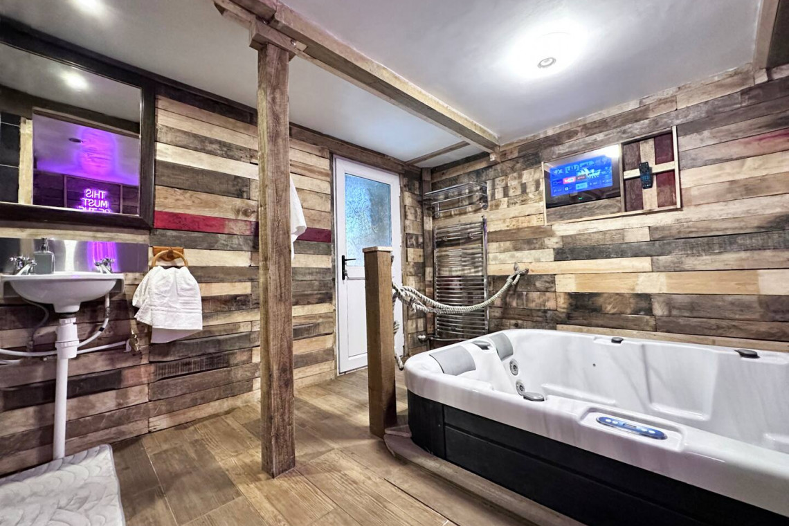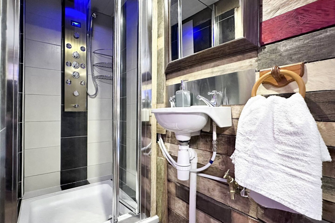 The space is open plan with complete flow… A double bedroom that flows into the living space area via bifold doors… which then flows through to a spacious and versatile kitchen. The kitchen leads out to the garden area which incorporates a picturesque gazebo, a urinal cubicle for convenience and access to our ‘special’ basement SPA room.