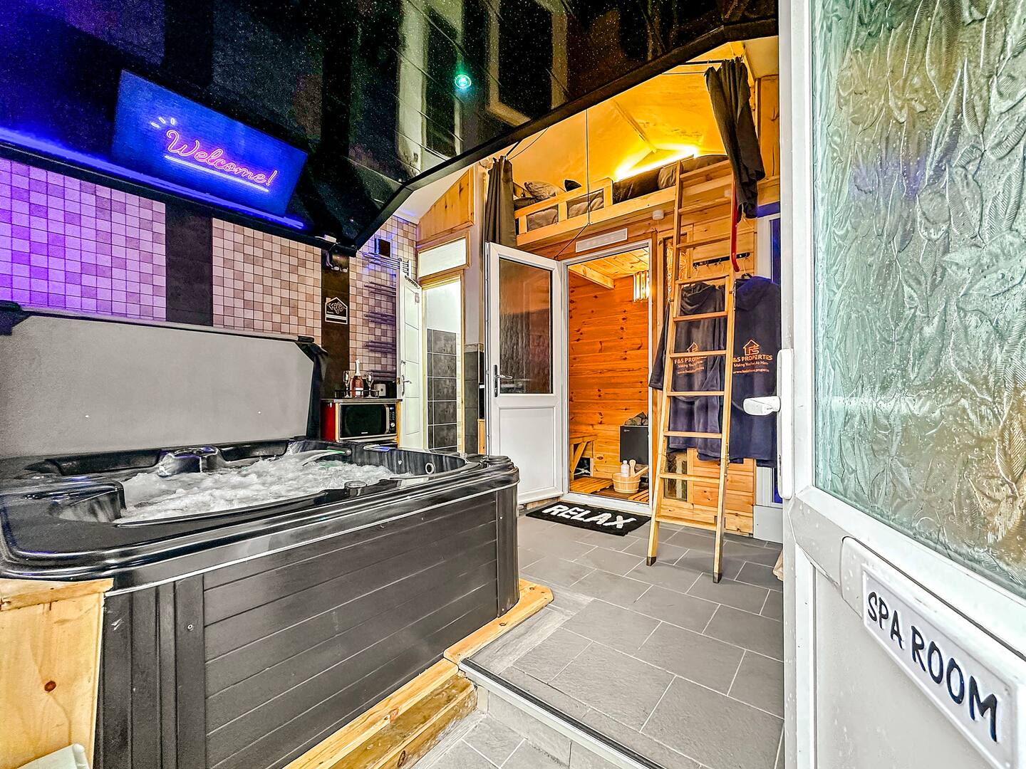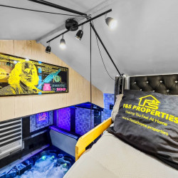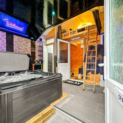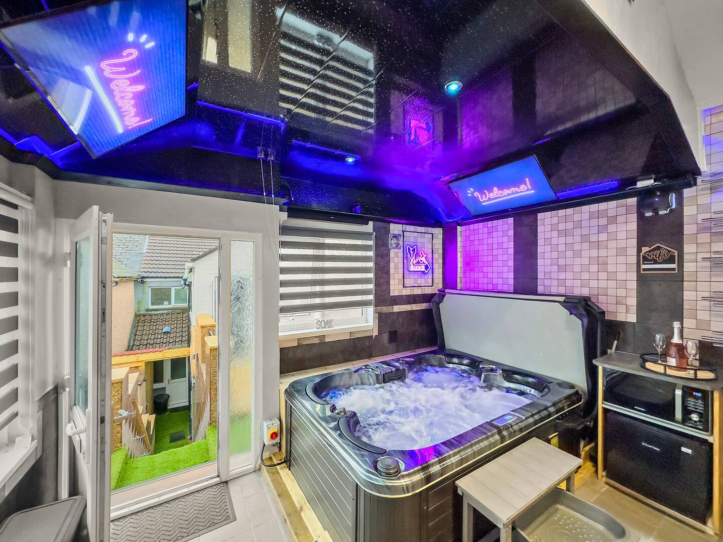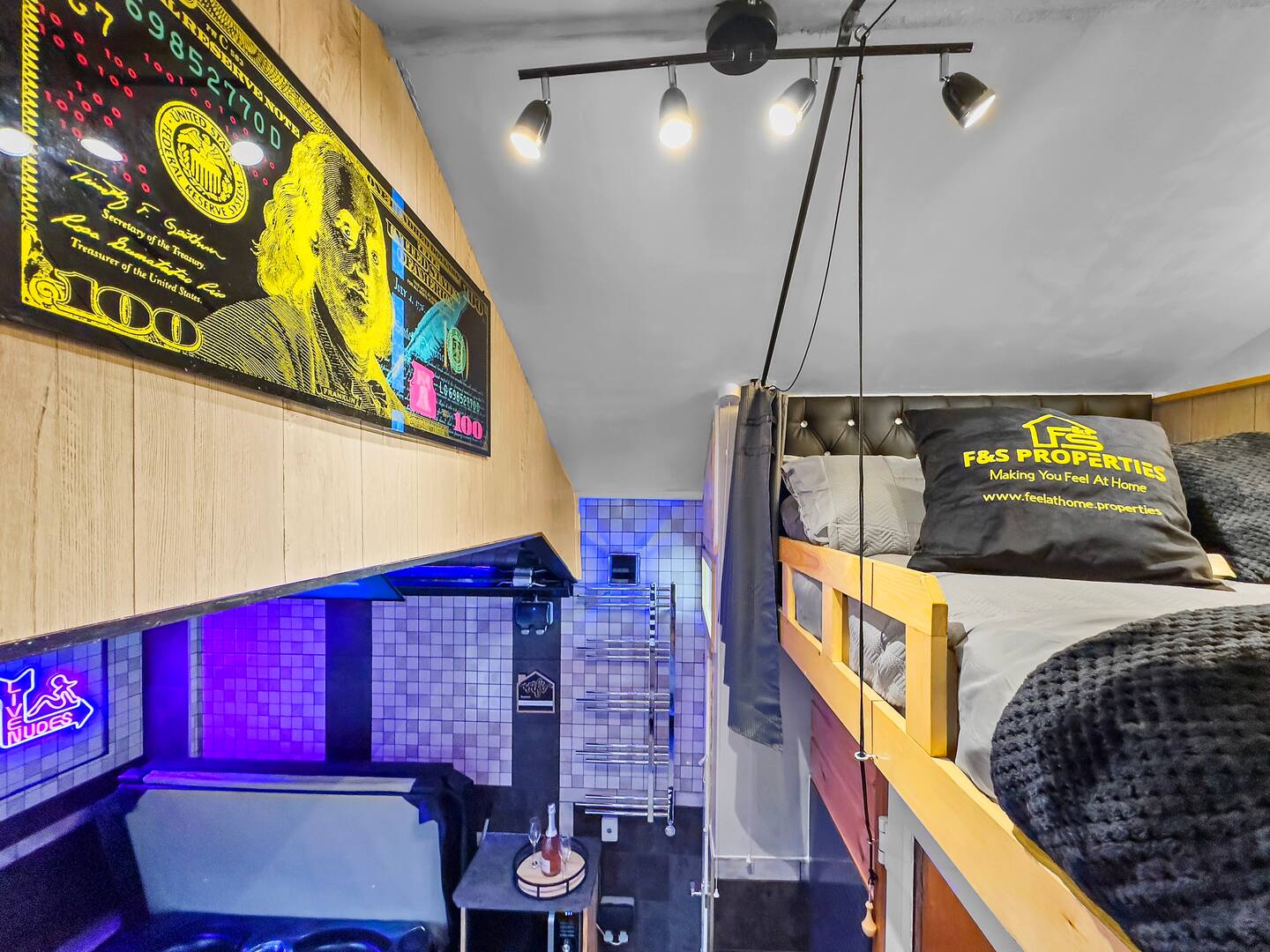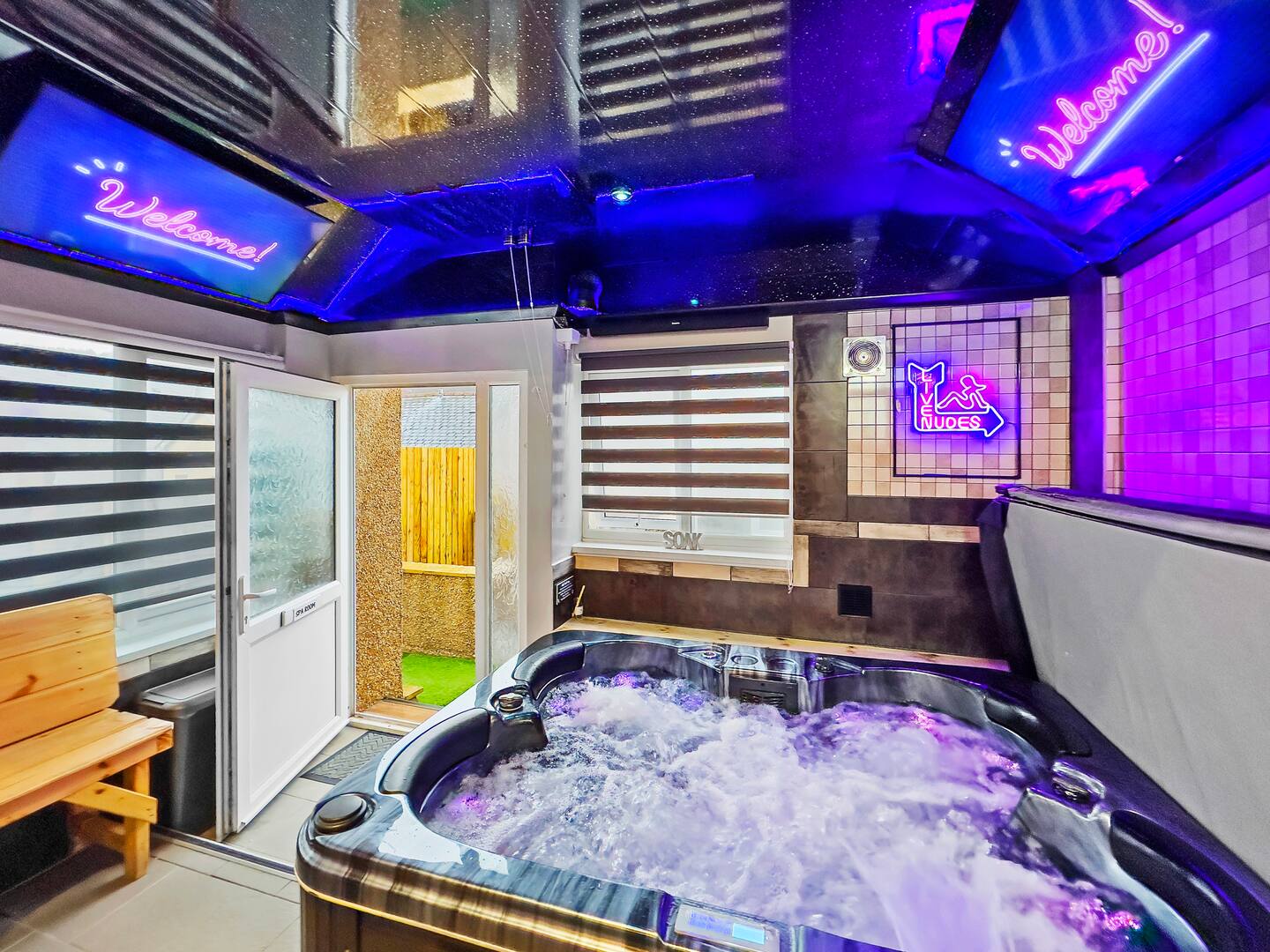 Welcome to our spa apartment retreat – where comfort, calm and good vibes meet. Escape the daily hustle in your private hot tub and sauna, surrounded by relaxing neon mood lighting. Enjoy multiple Smart TVs throughout. The cozy loft bed (2.4m high) is set in the spa-style wet room. A separate VIP dry lounge offers added comfort. Perfect for a romantic stay, spa weekend, or relaxing break. Quirky Space!