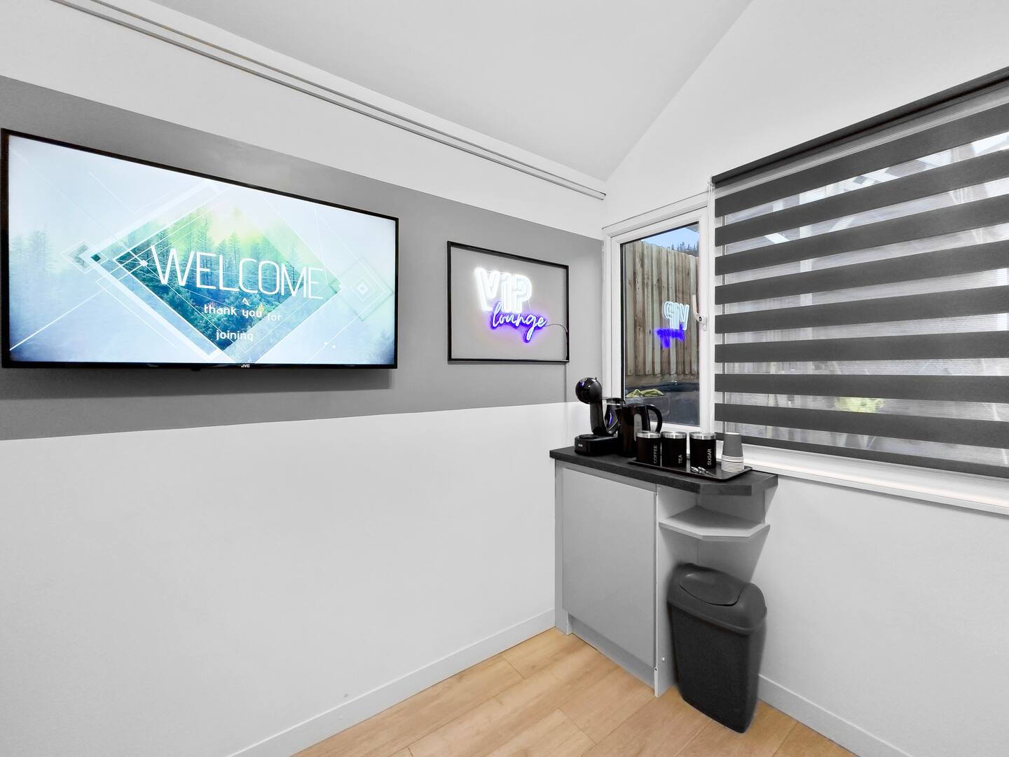 VIP Lounge: enter the welcoming ‘shared’ lounge room, furnished with a smart TV and a coffee machine offering complimentary tea bags and coffee pods, accessible directly from the elevated tier of the communal garden area.