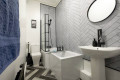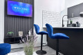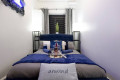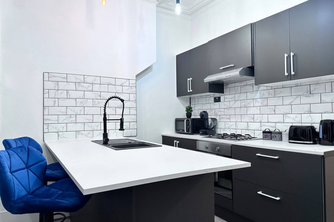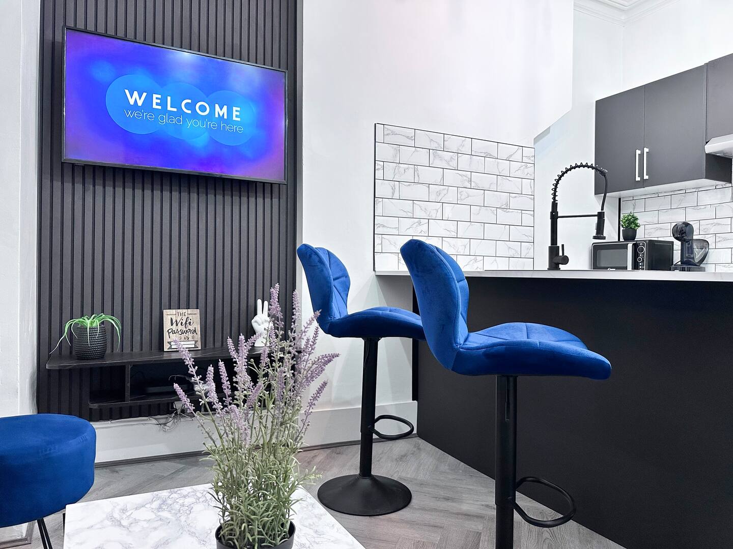 High ceilings create a spacious feel, with Wi-Fi, smart TVs, and a coffee machine for comfort. Features a cozy double bedroom, full kitchen, and sleek bathroom.